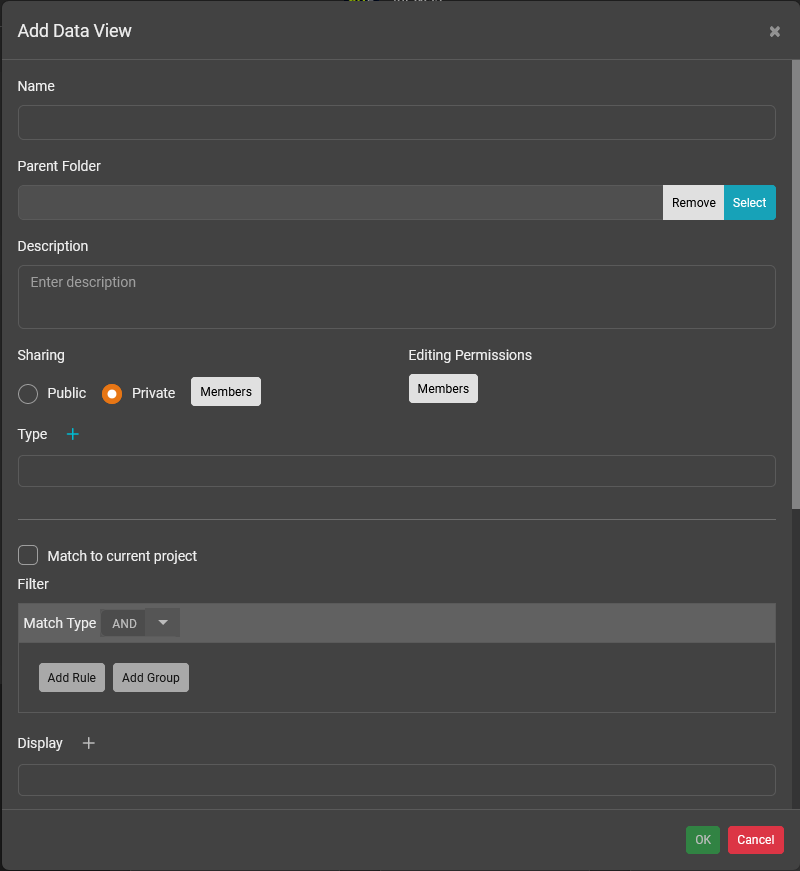 Select the Match to current project checkbox if you wish to use this data view on project dashboards.