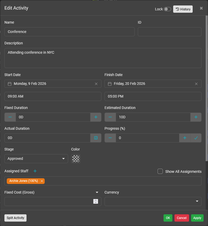 View the actual cost of completing the activity to date. The actual cost is calculated by using the activity's actual duration (or work effort completed by the assigned staff thus far) , the assigned staff's cost rate and assigned staff's utilization. This provides a real-time cost metric to the actual costs that have been incurred to date to complete the activity by the assigned staff.
