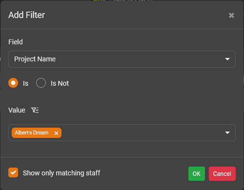 Example: You wish to see only those staff that are assigned to bookings or tasks in a project. You would add a filter using Project Name field and you would select the Show only matching staff checkbox. Example: You wish to see only the tasks and bookings that have a certain stage (or status) so you know which ones you need to re-allocate to staff in your departments. You would add a filter using Stage Name field and you would uncheck the Show only matching staff checkbox.You can edit a filter by clicking on the filter in the Staff Planner toolbar.