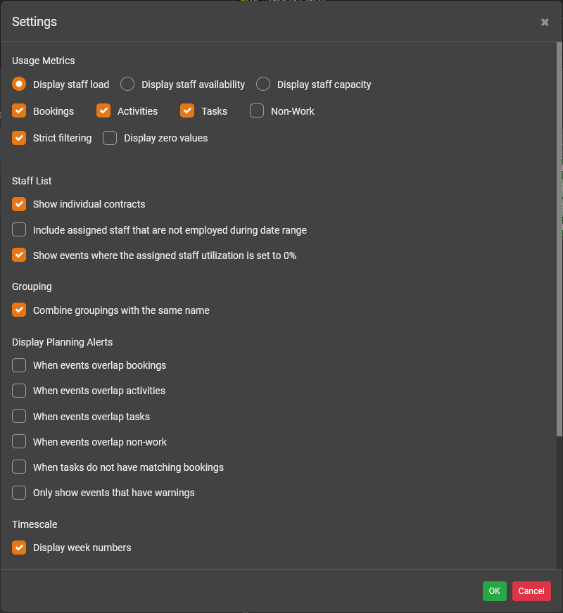 Example: You want assigned tasks in projects to be counted in the overall staff usage metrics so you can see when your staff are overallocated. In this case, you would turn on the Tasks checkbox.